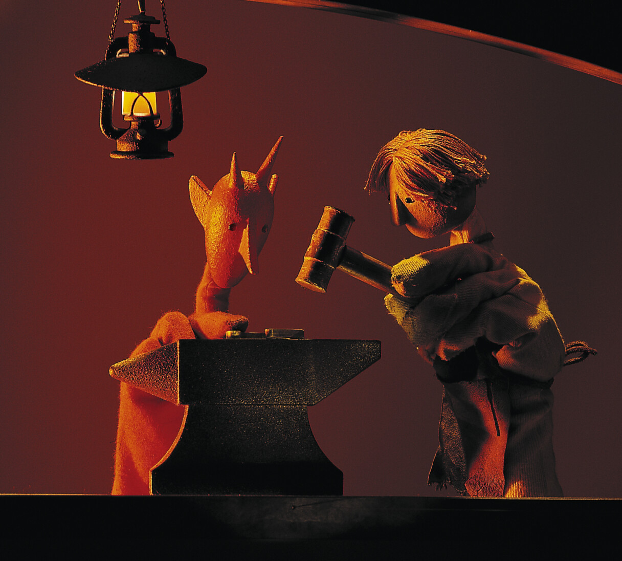Die Schöne und der Schmied ist ein romantisch-phantastisches Puppenspiel voller Humor, Liebe, Licht und Kohlenstaub. Marc Schnittger spielt mit Hand- und Stockpuppen auf mehreren Ebenen hinter drei Paravents.